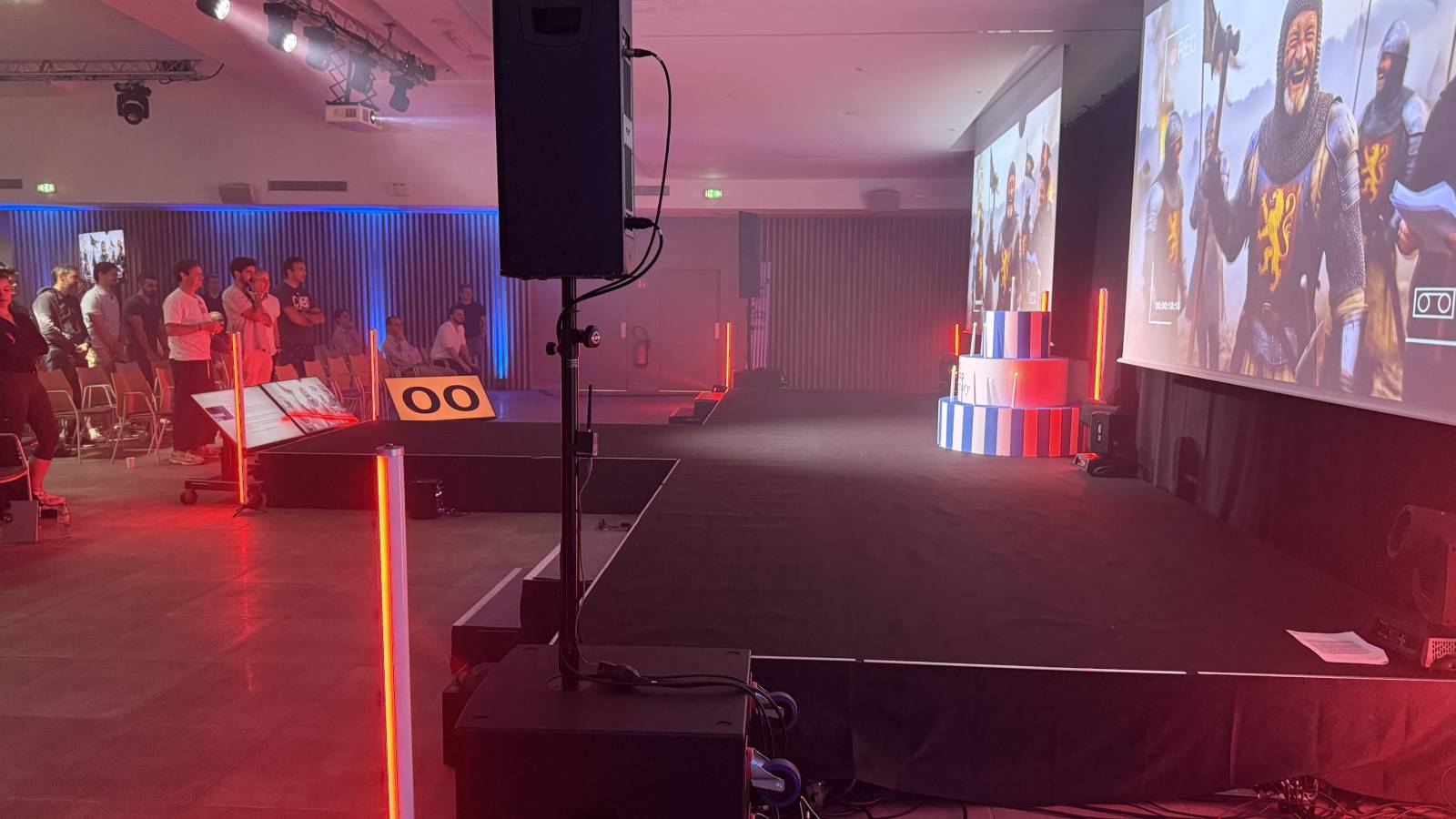 Nos équipes ont conçu un podium personnalisé avec une scène de 10 x 3 mètres et une avancée de 3 x 2 mètres. L’ensemble a été habillé avec moquette, juponnage et rideau de scène noir pour un rendu professionnel et soigné.