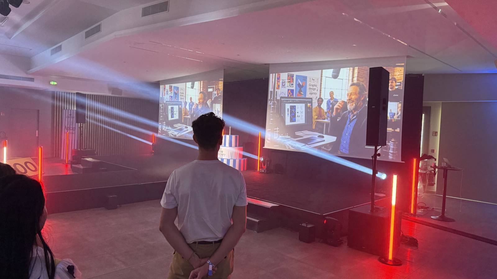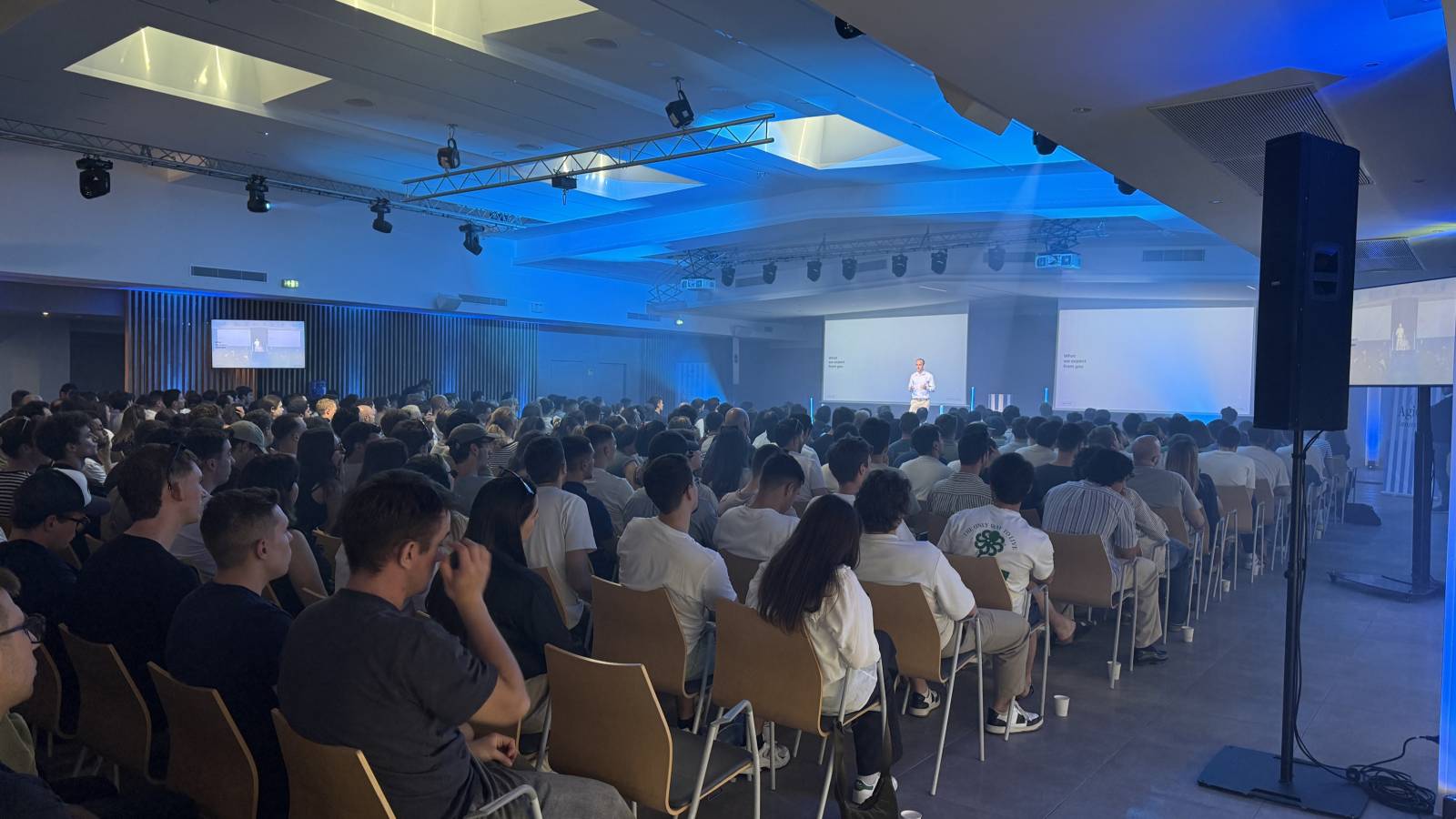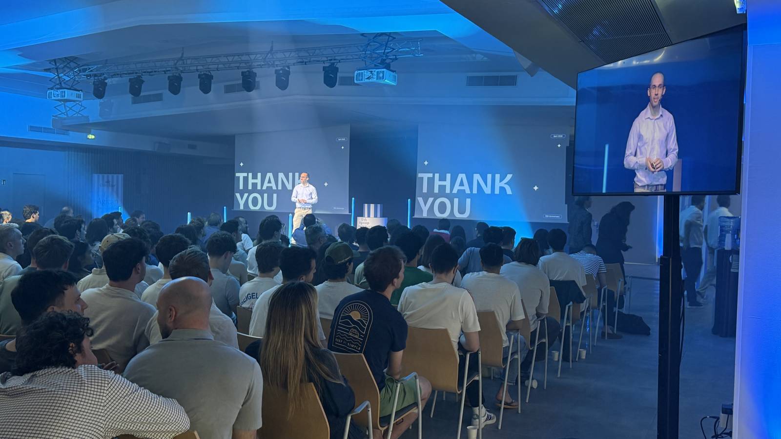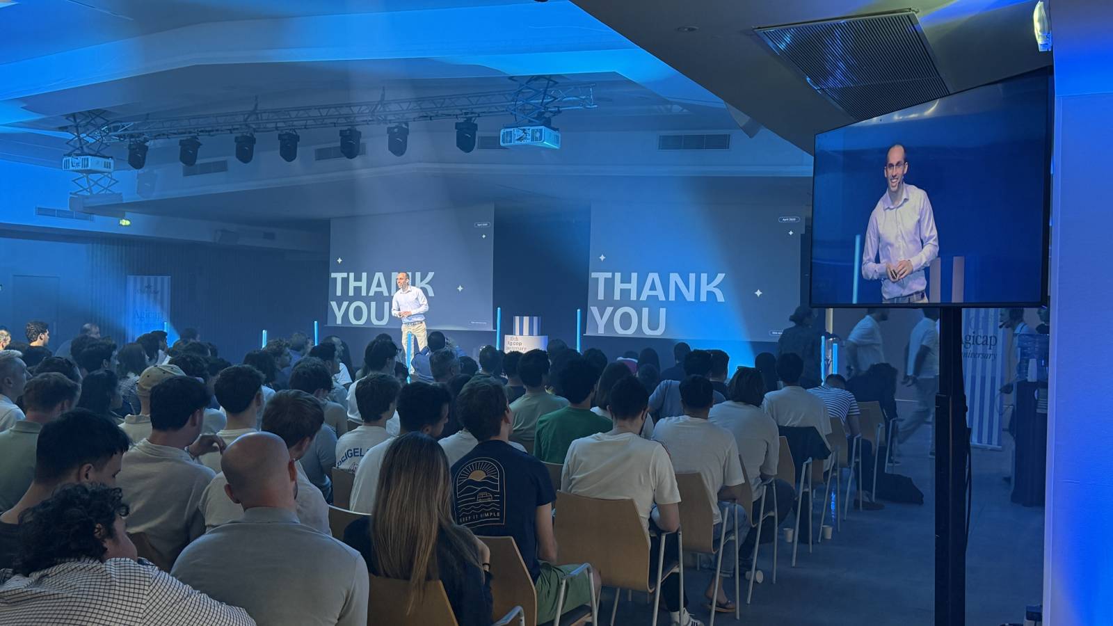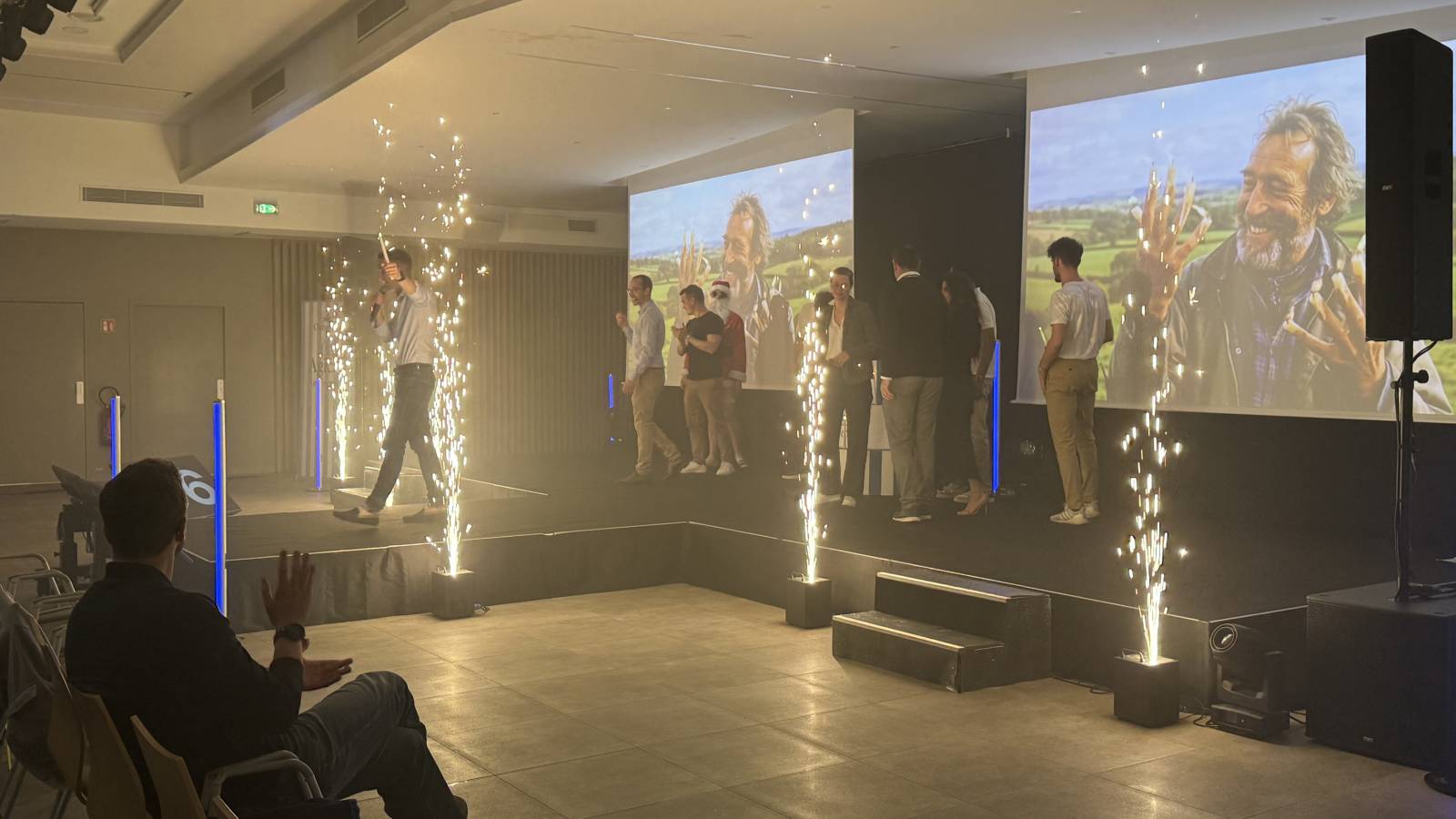Notre régie lumière a assuré l’éclairage de la scène avec lyres LED wash, spots hybrides 7R, machine à brouillard et effets spéciaux avec machines à étincelles. Une mise en scène dynamique idéale pour rythmer les prises de parole et valoriser l’image de l’entreprise.