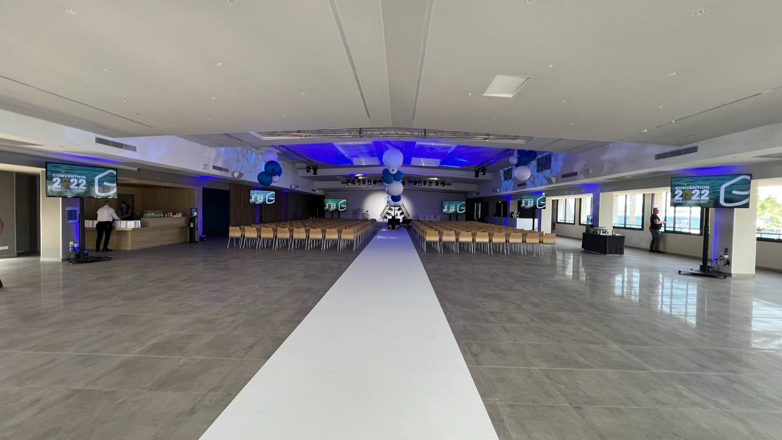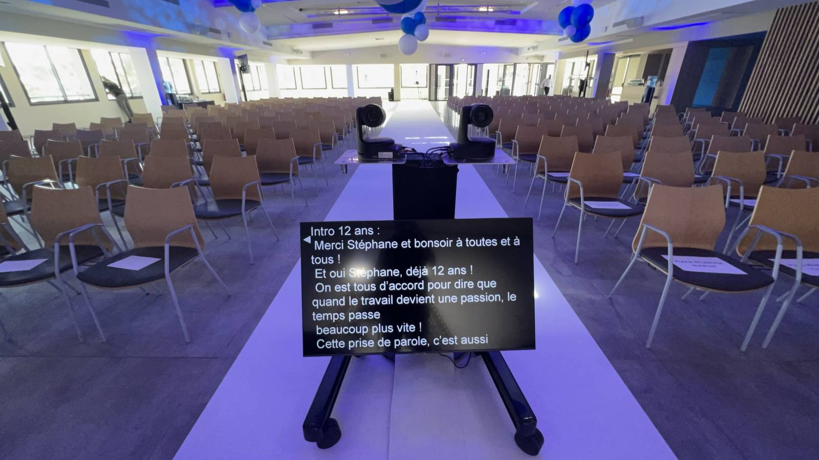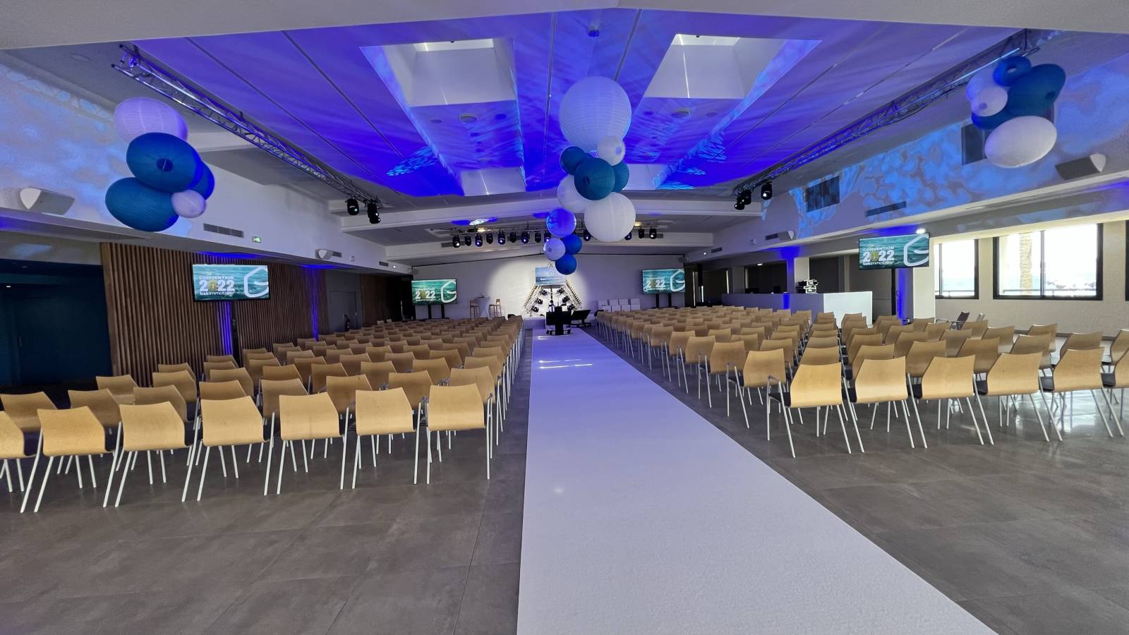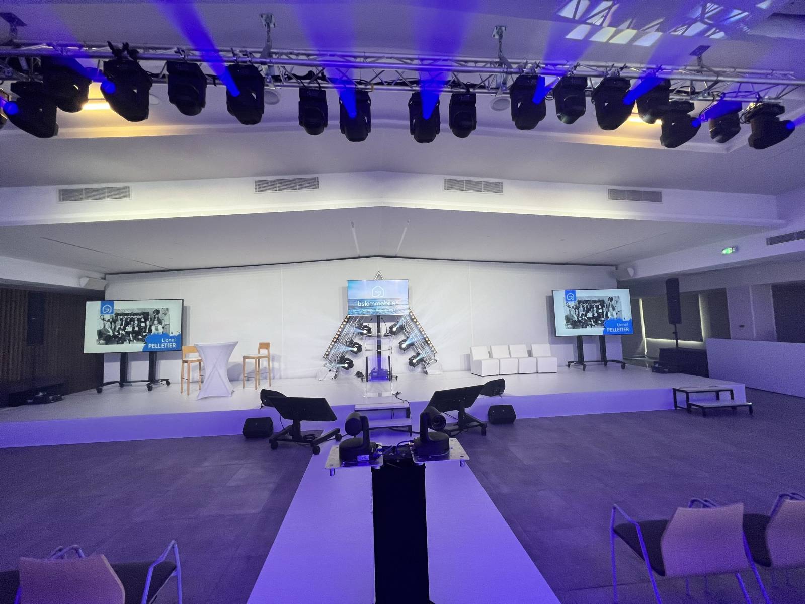 Scène avec moquette blanche , marches , juponnage de scène