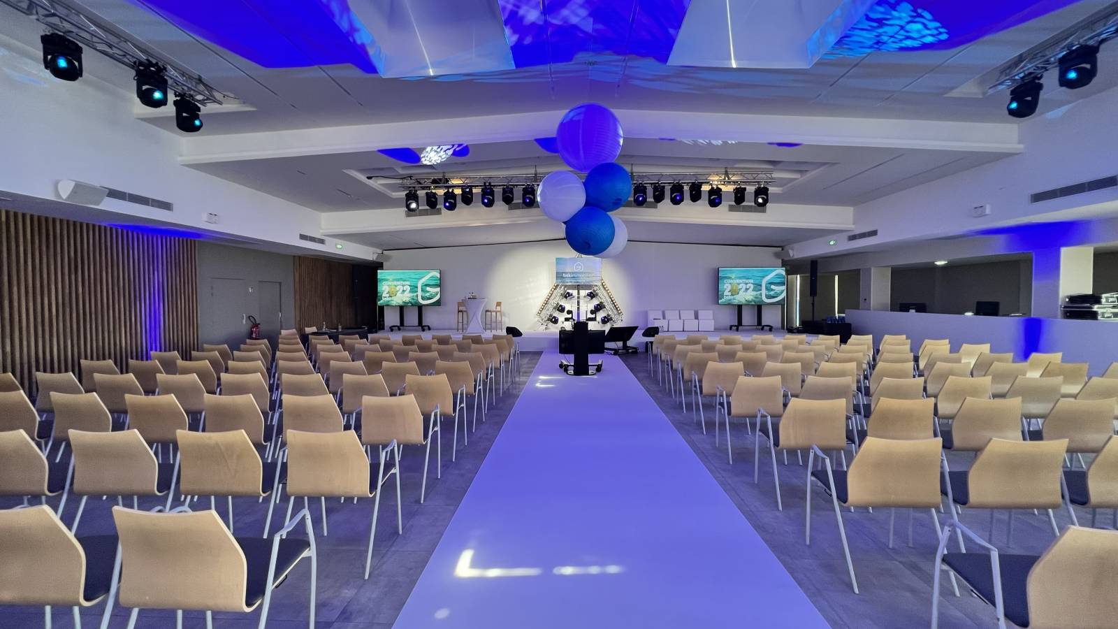 Fond de scène avec menuiserie sur mesure fond blanc occultant