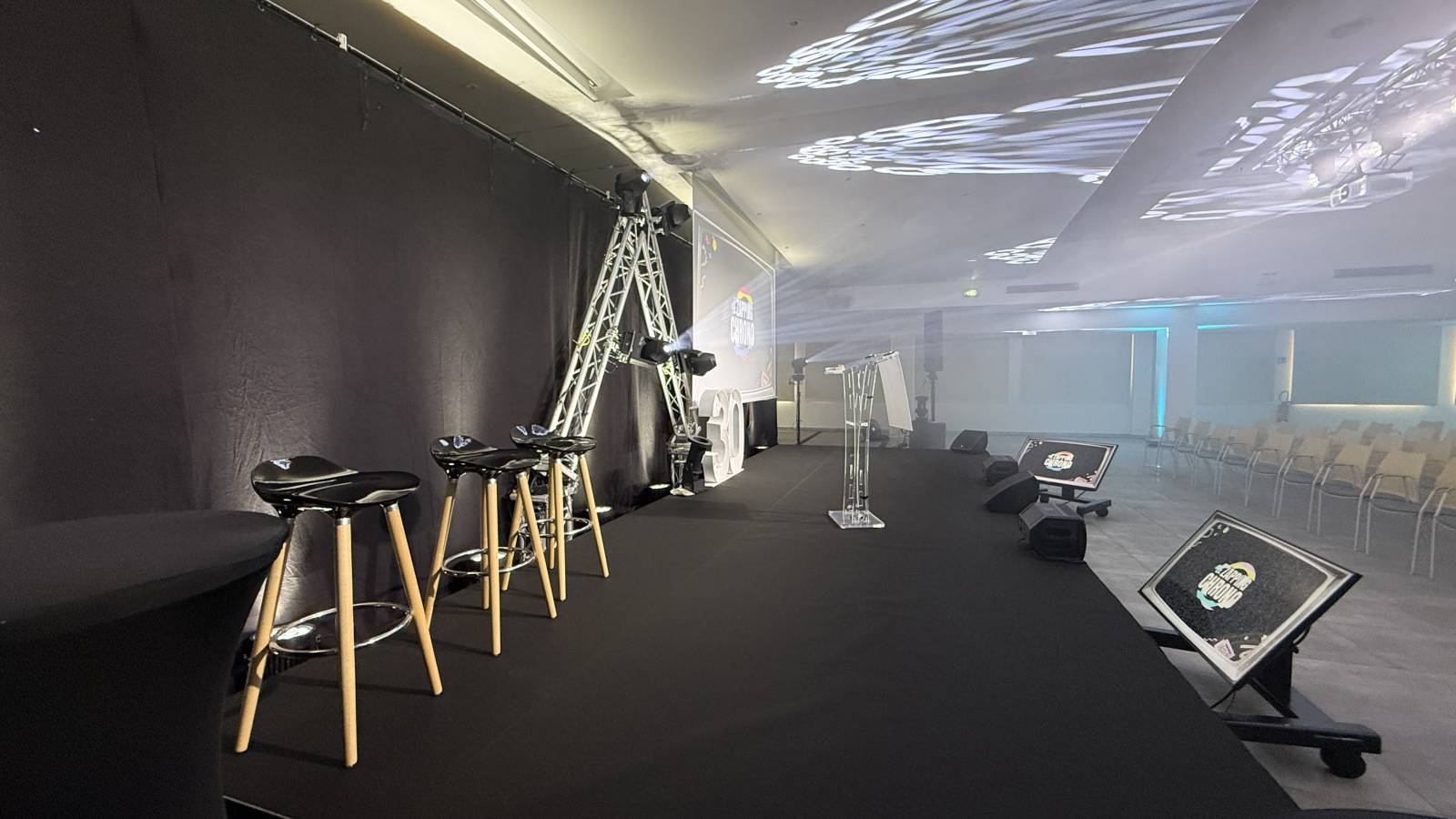 Une grande scène avec moquette et juponnage noir, nos tabourets haut pour une assise confortable ,