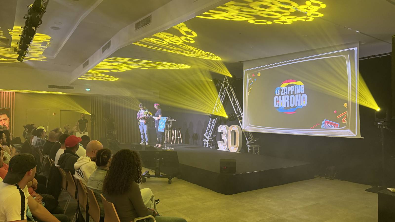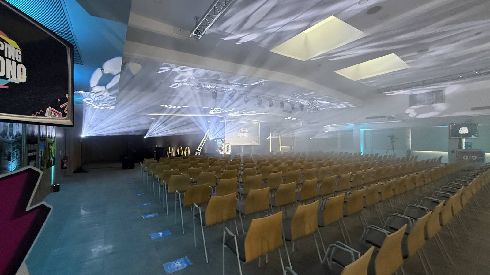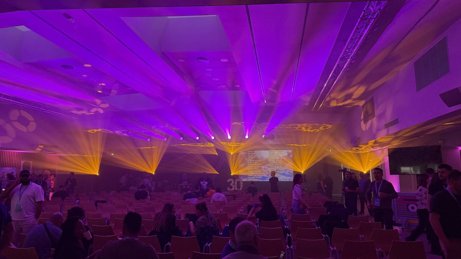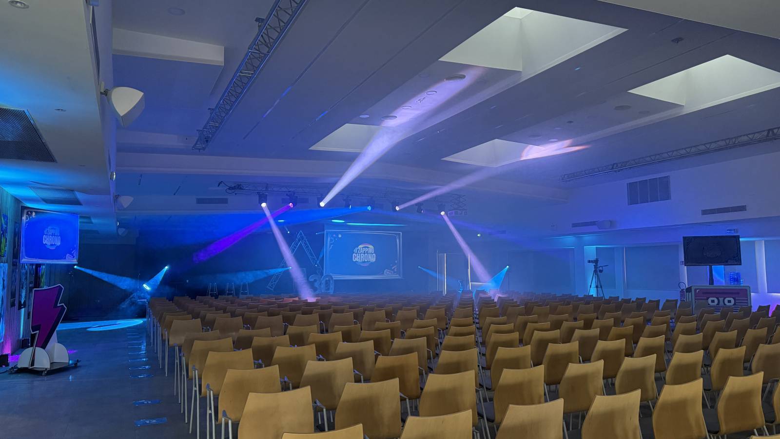 Un éclairage de qualité pour un rendu optimal, éclairage de la scène , éclairage et mise en lumière de la salle Avec projecteurs sur batteries, éclairage plafond , le tout avec un léger brouillard pour donner du relief, l'ensemble est commandé par notre ingénieur lumière pour une mise en lumière et couleur personnalisée pour chaque client et à l'image de son entreprise.