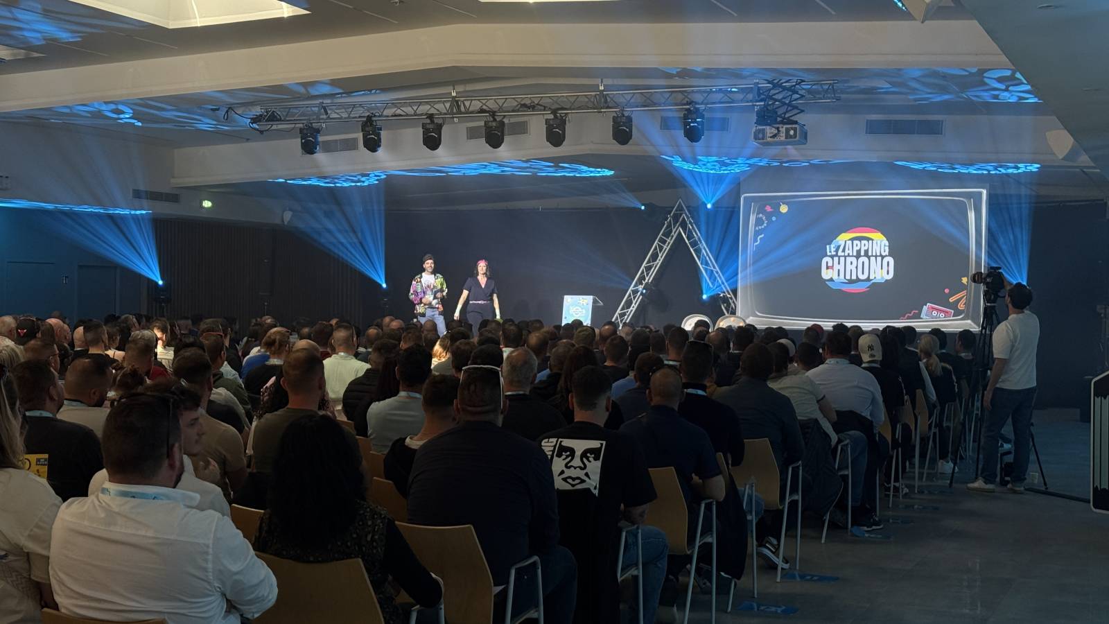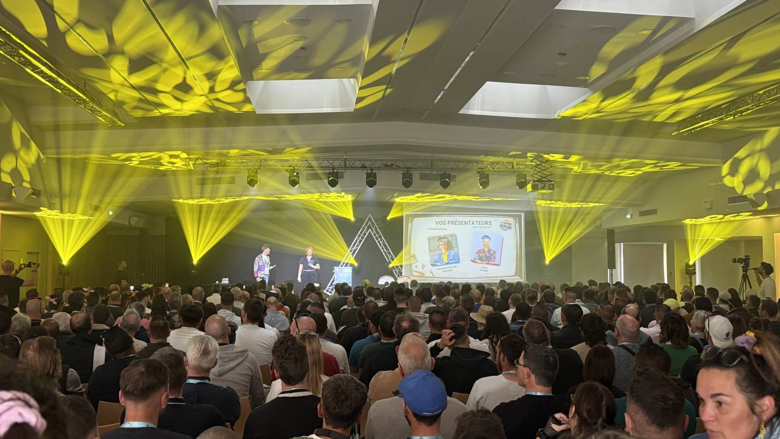Coté video, utilisation des 2 écrans du lieux et videoprojecteurs, 2 écrans de rappels dans la salle pour la public , et 2 écrans de retour en pied de scene pour les intervenants, une régie video pour les envoi des médias, powerpoint , videos , reprise cam, stress live sur internet, notre pavloff trés pratique pour les intervenants sur scéne pour faire défiler les slides