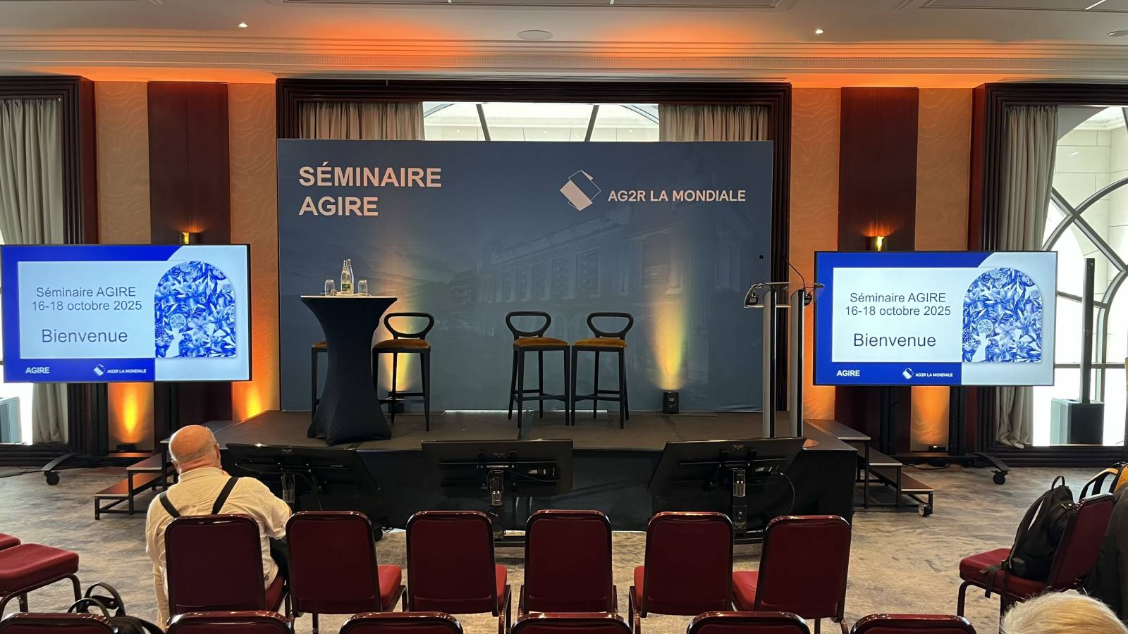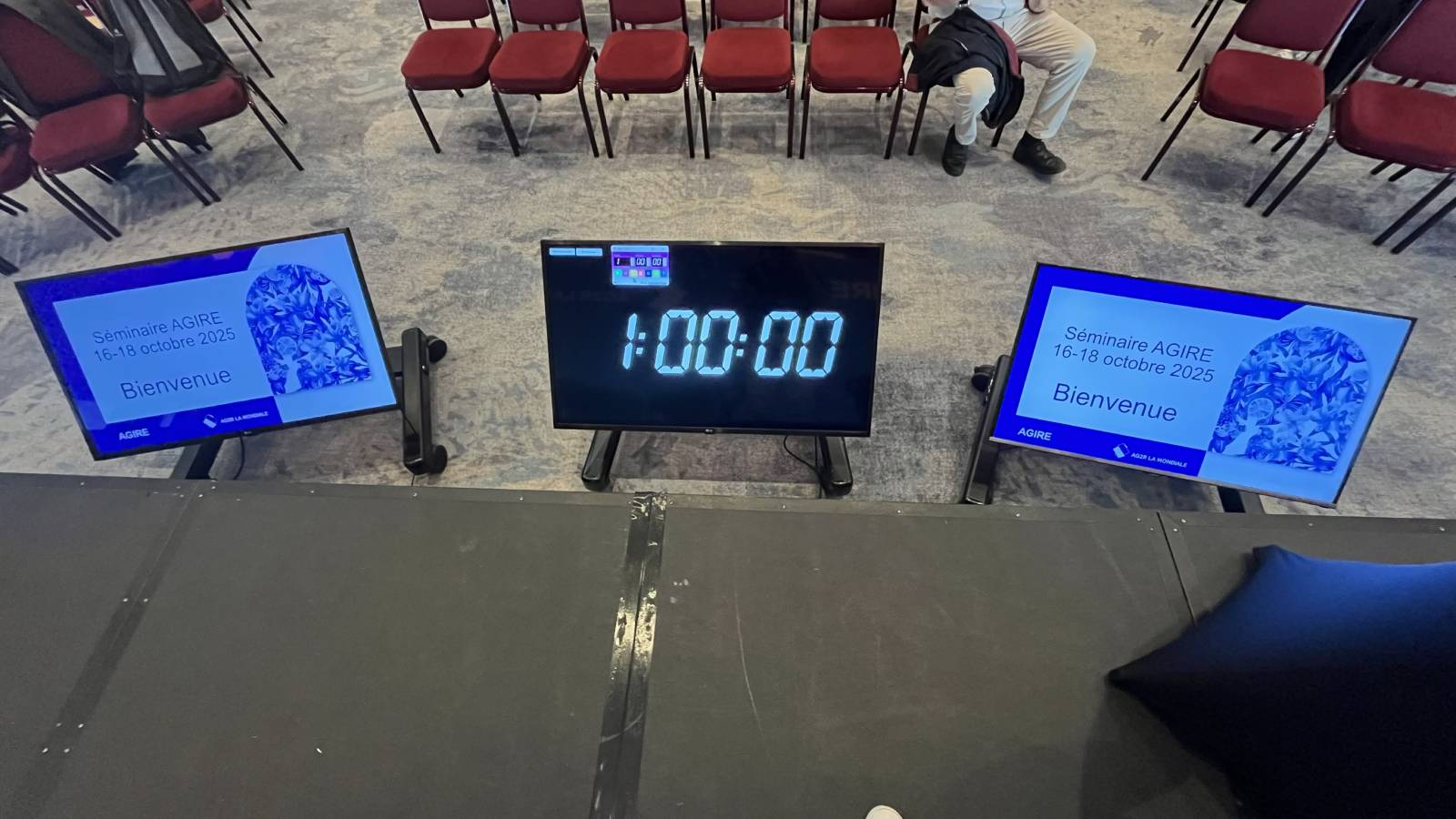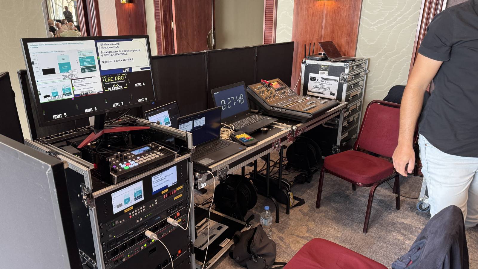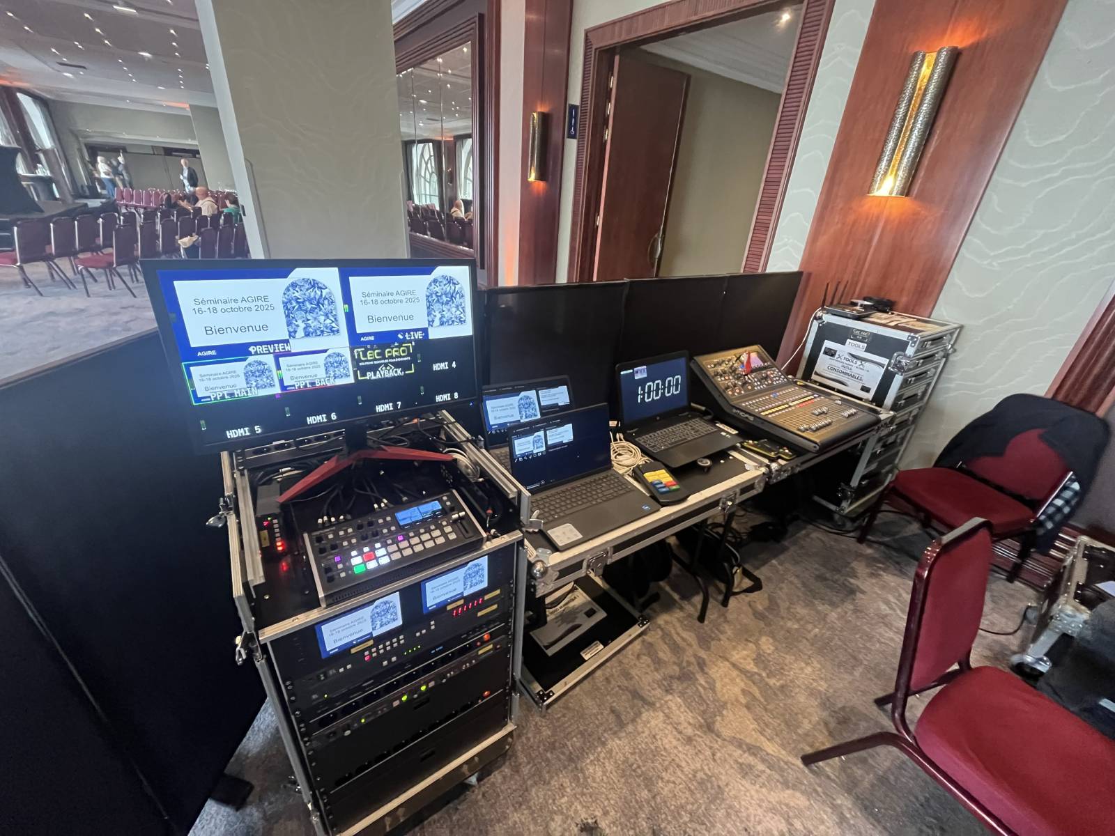 Régie video numérique, avec envoi de powerpoints et videos, pavloff, 3 écrans de retour avec timer, écran 98 pouces pour une vision optimale, streaming live zoom