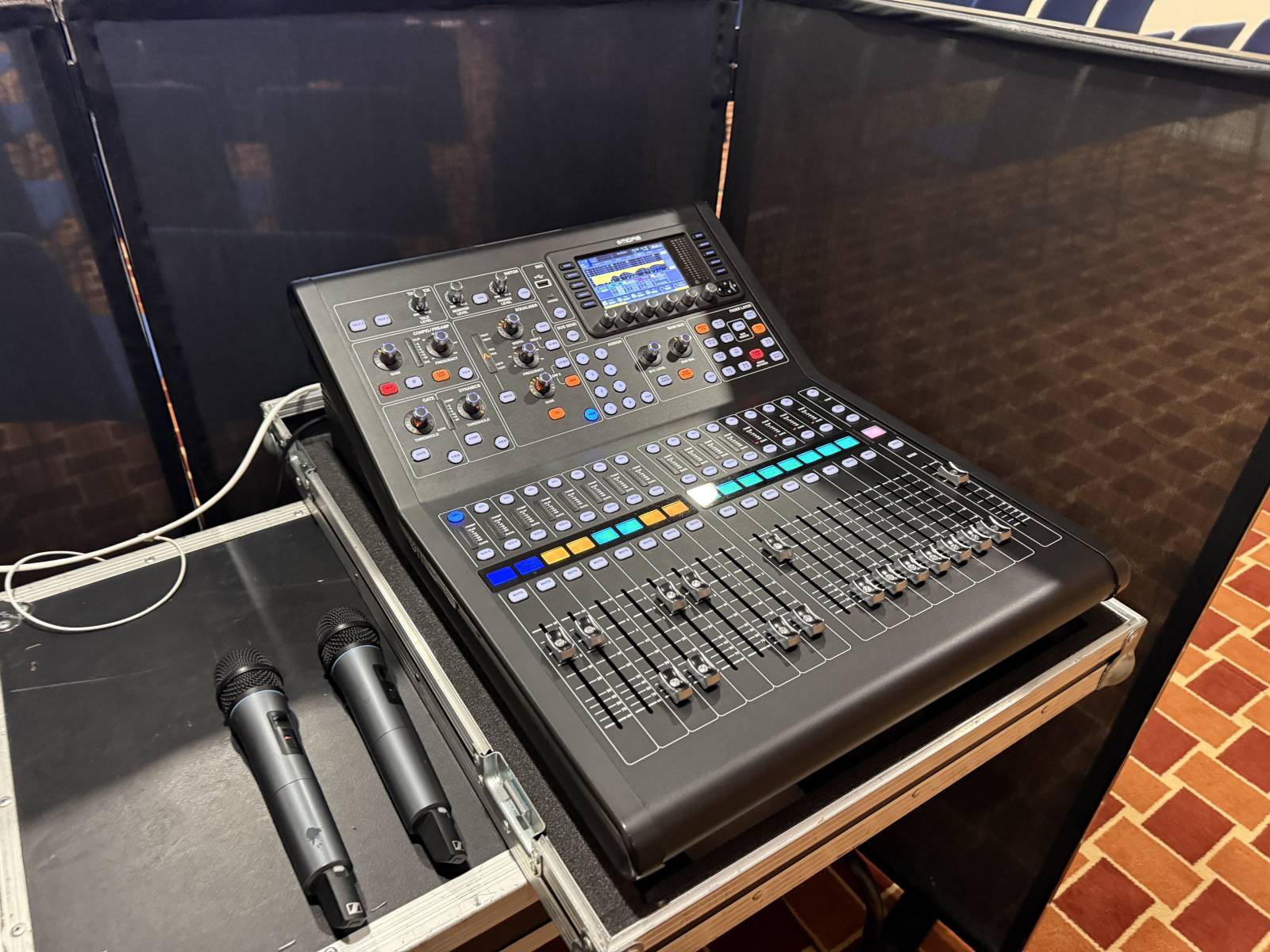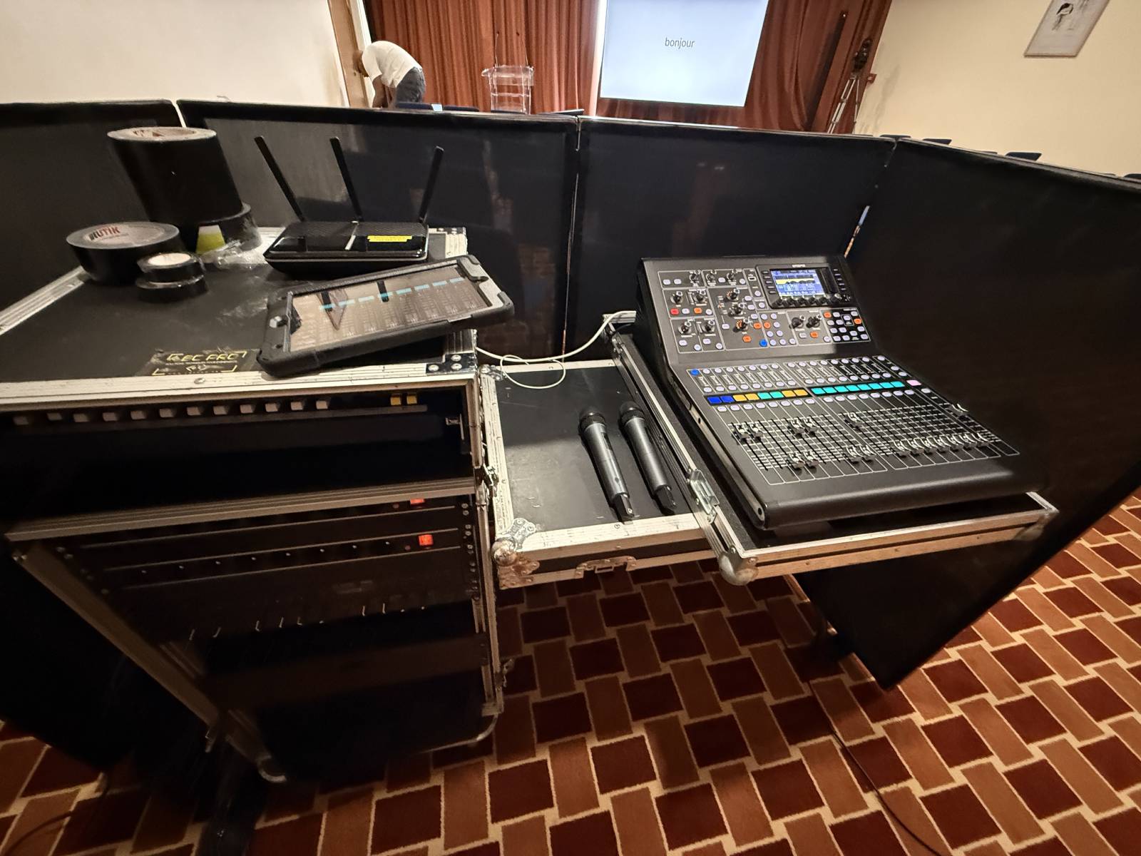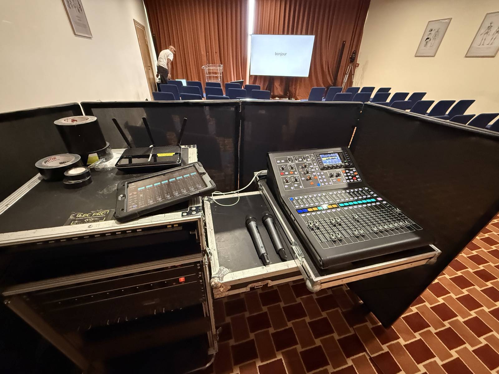 Enceintes de sonorisation jbl avec micro sennheiser et console de mixage midas