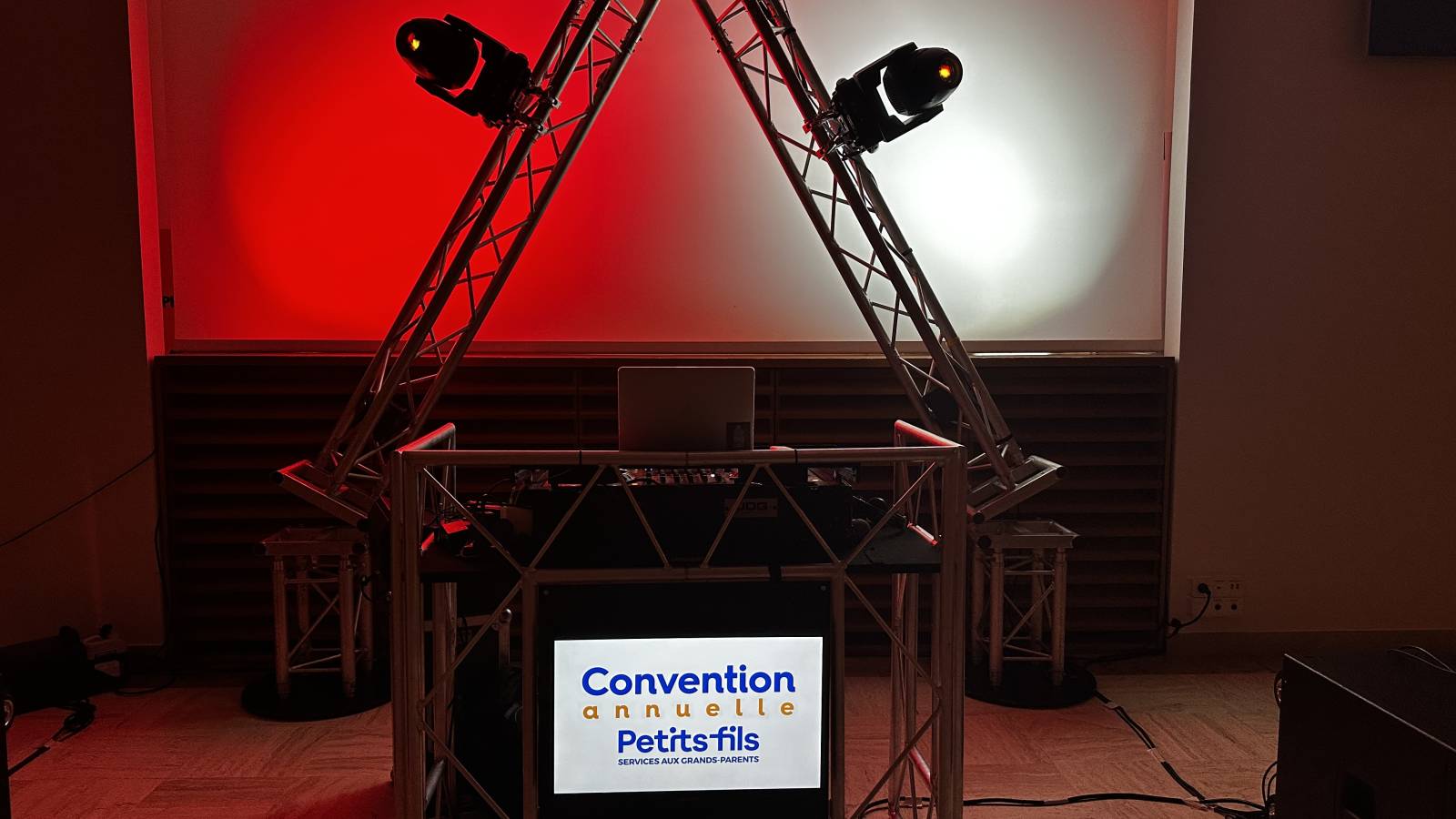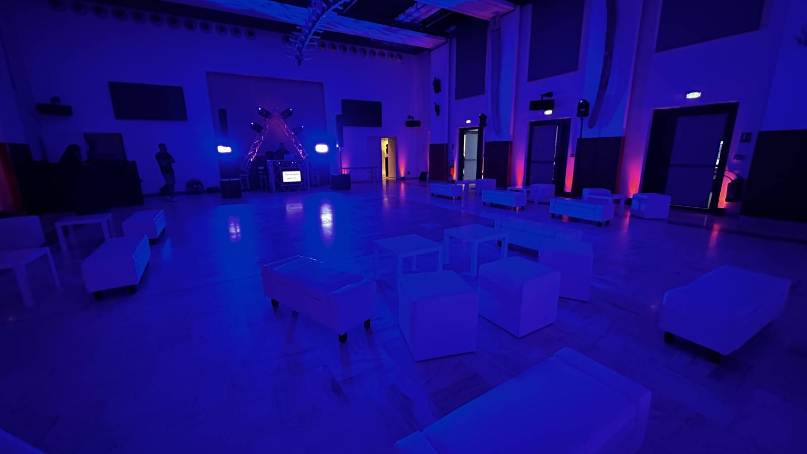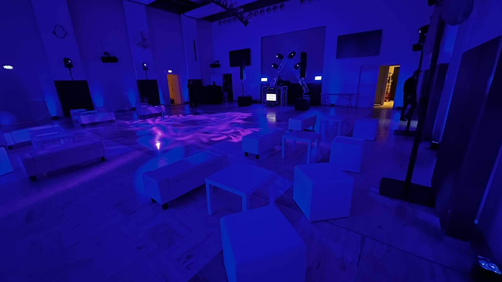 Sonorisation, Eclairage, Desk dj avec logo du client, Mobilier lounge, ambiance aux couleurs chaleureuses , pour une soirée réussie, dj Bruno aux platines, l'équipe technique de LBC PRO pour une prestation réussie