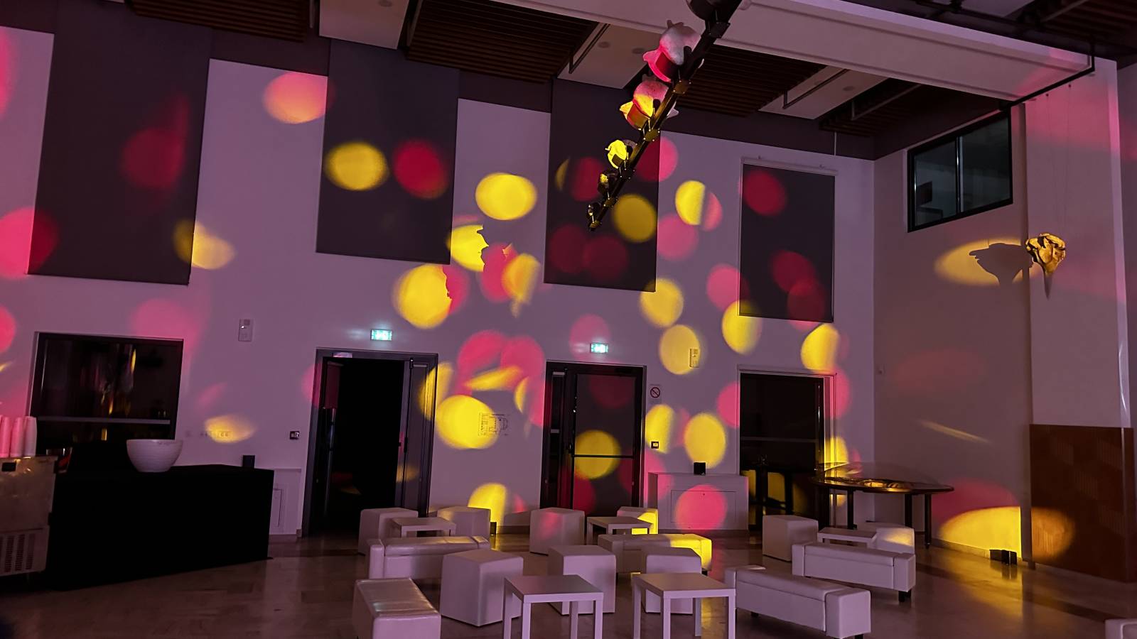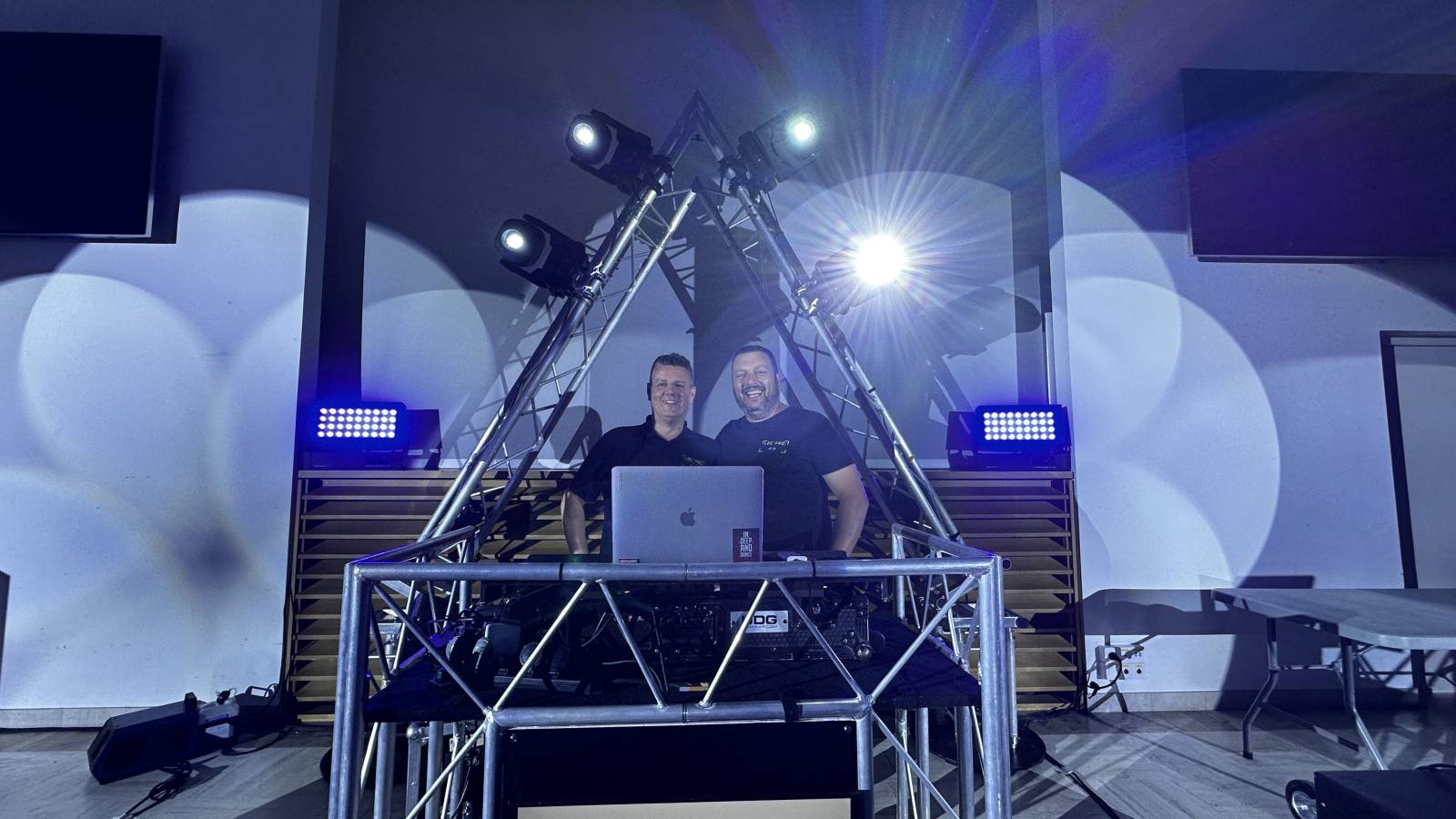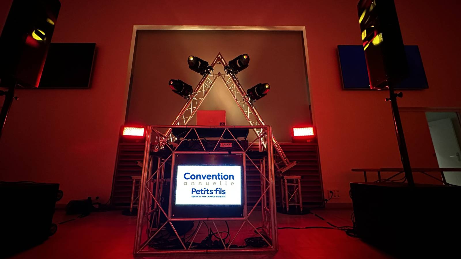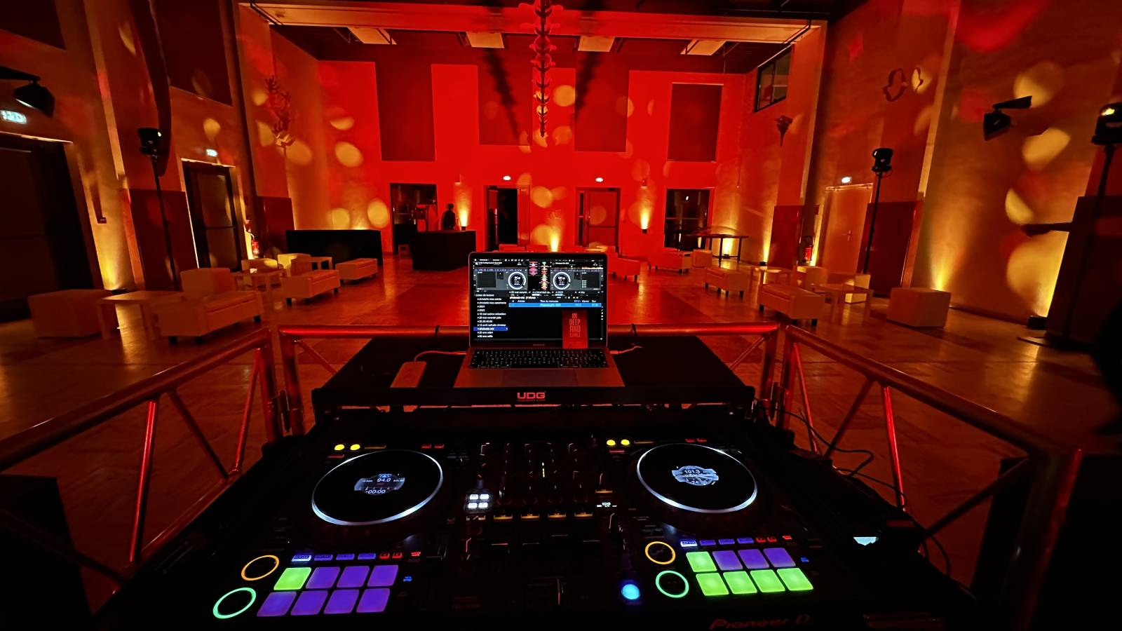 Sonorisation, Eclairage, Desk dj avec logo du client, Mobilier lounge, ambiance aux couleurs chaleureuses , pour une soirée réussie, dj Bruno aux platines, l'équipe technique de LBC PRO pour une prestation réussie