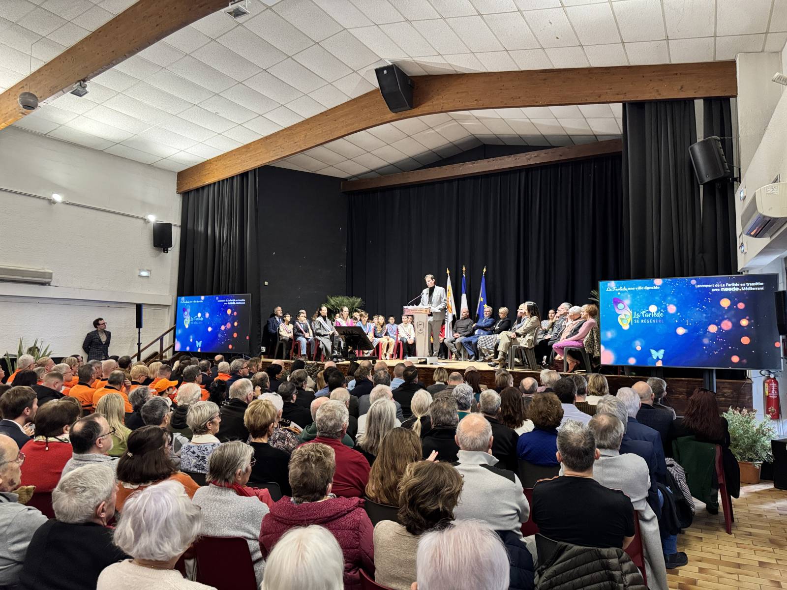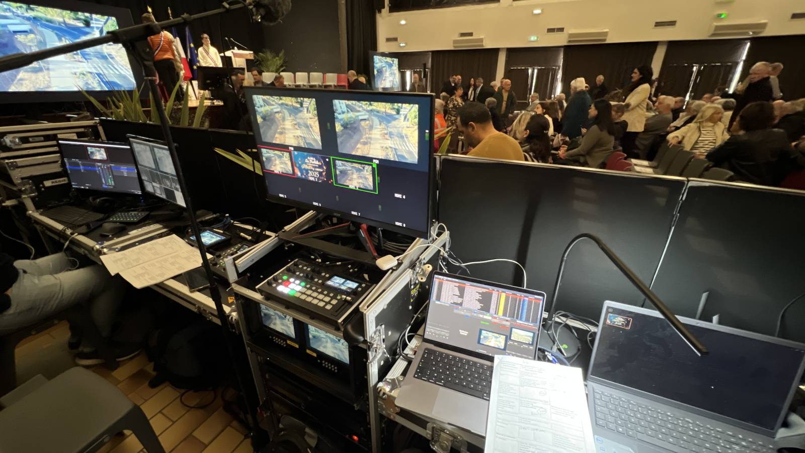 diffusion sur 2 écrans 98' et un écran de rappel 65' et un écran de retour pour mr le mairie, diffusion et gestion des médias, ppt , videos, captation multi cameras, enregistrement live
