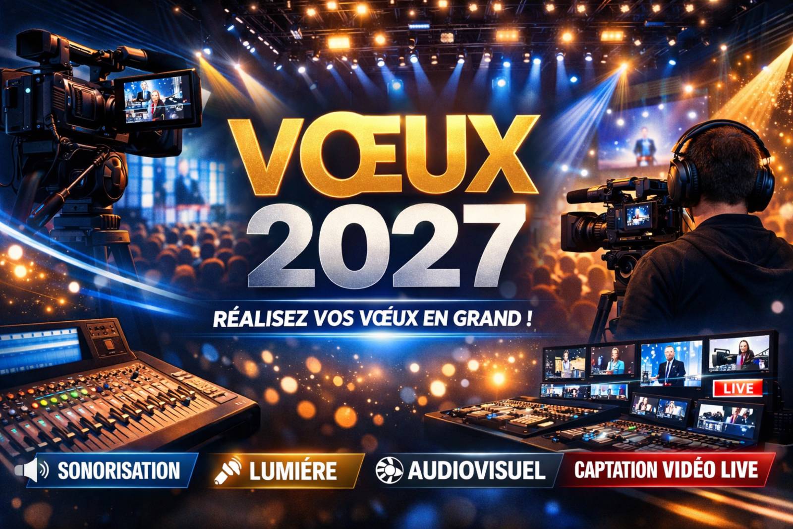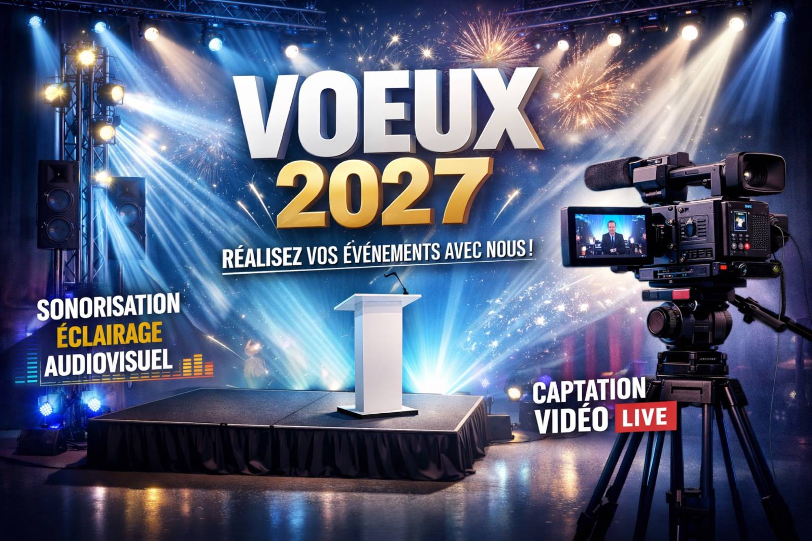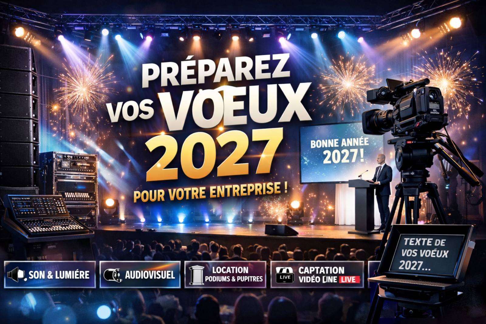 Depuis plus de 20ans, LBC PRO est le prestataire technique privilégié pour assurer la partie technique de vos vœux d’entreprise. Nous prenons en charge tous les aspects techniques, de l’éclairage au son en passant par l’équipement de la salle, pour des vœux d’entreprise inoubliables.