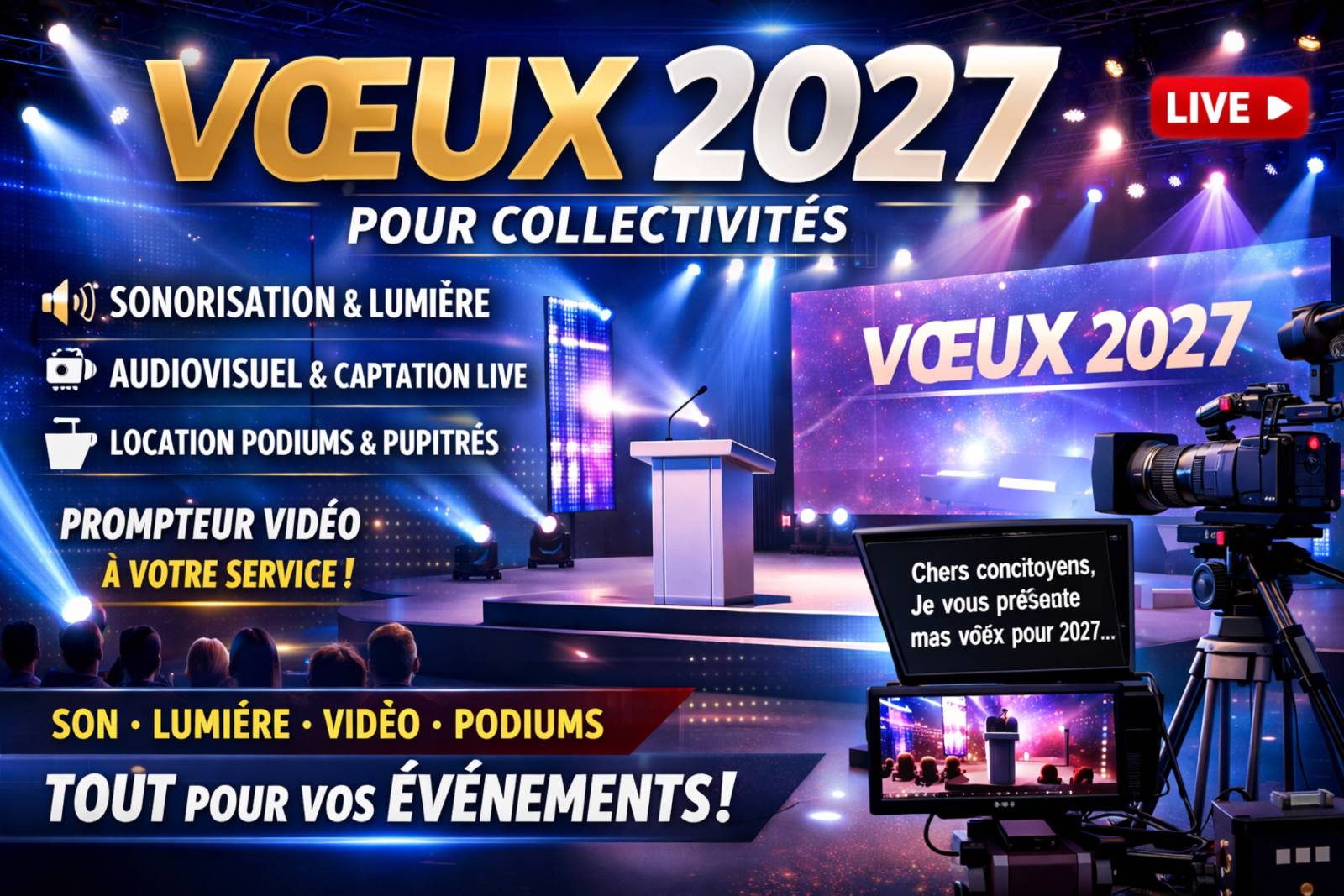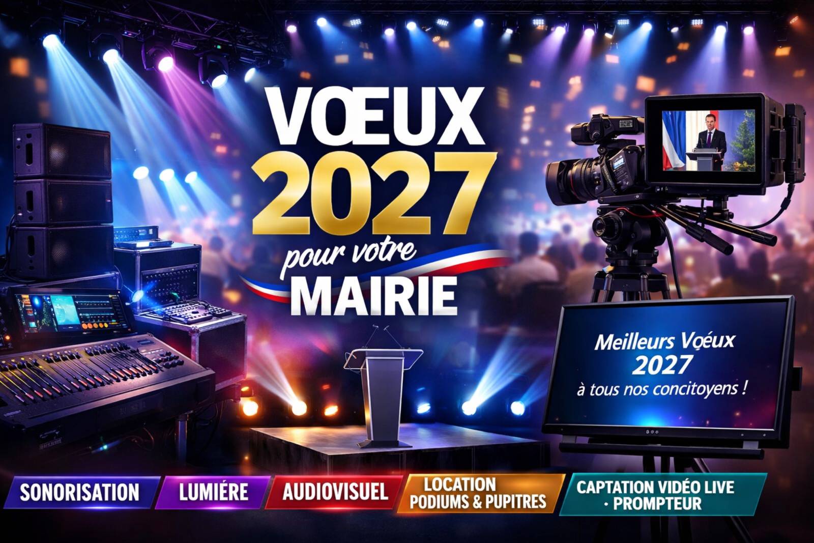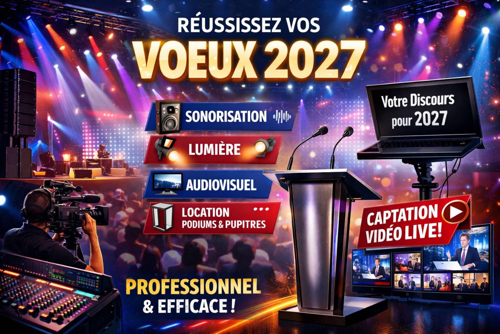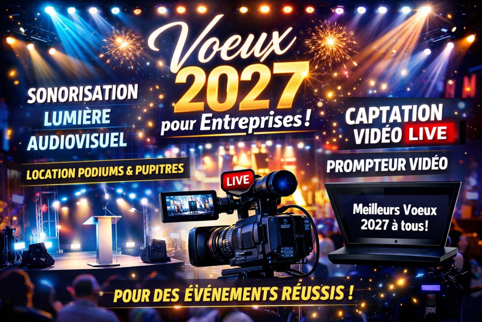 Depuis plus de 20ans, LBC PRO est le prestataire technique privilégié pour assurer la partie technique de vos vœux d’entreprise. Nous prenons en charge tous les aspects techniques, de l’éclairage au son en passant par l’équipement de la salle, pour des vœux d’entreprise inoubliables.